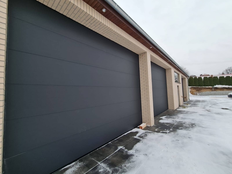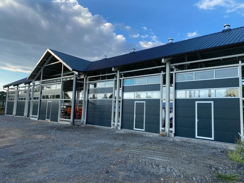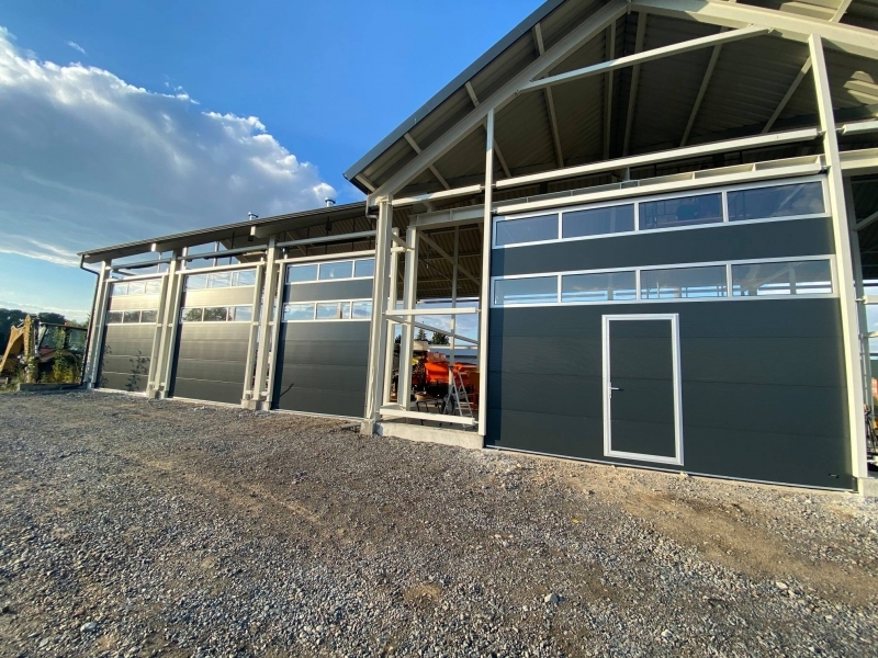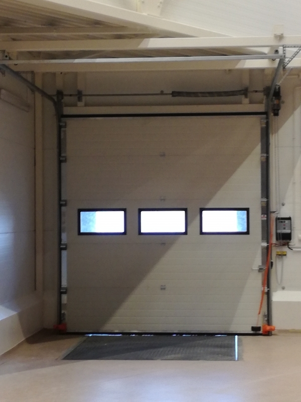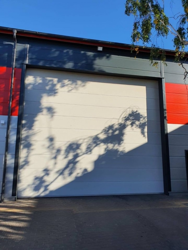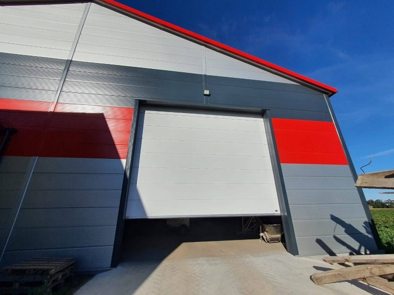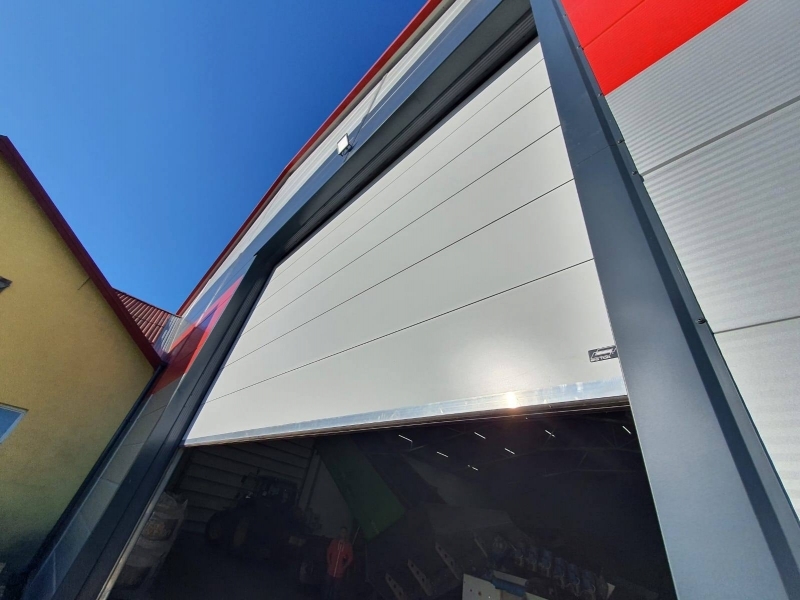 Potężna brama przemysłowa BiG TOR ISO60. Panel płaski, bez deseniowania POLYGRAIN RAL 9010 izolowany 60mm. Napęd nasadowy BiG TOR AUTOMAT OSE OKUCIA 3". Profil wzmacniający na każdej sekcji. Wymiary tych bram to B7000mmxH6000mm oraz B6000mmxH6000mm.